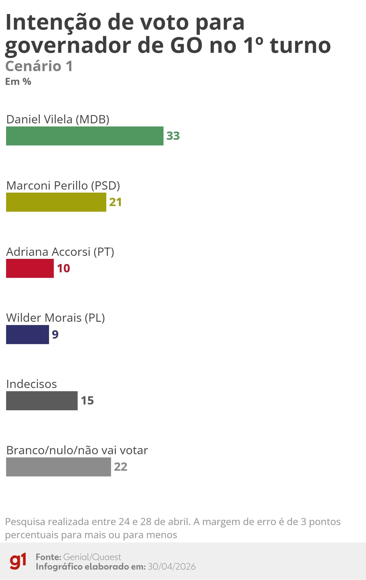 Quaest: Intenção de voto para governador de Goiás no 1º turno - Cenário 3 (abril/2026)